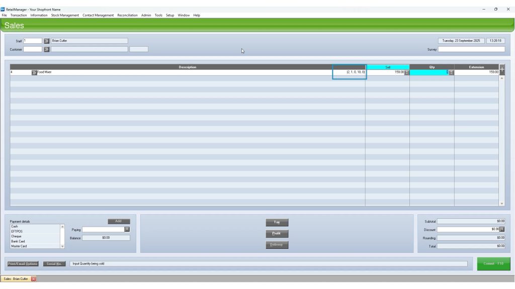 The Payment Details section is locked when there is a stock item in the edit item section of the sales list and the item has not been committed to the list. This fixes the issue where an operator can commit a sale whilst a stock item has not been committed to the list and is still in edit mode. This will now block the error where a user can initiate an EFT for a wrong amount.