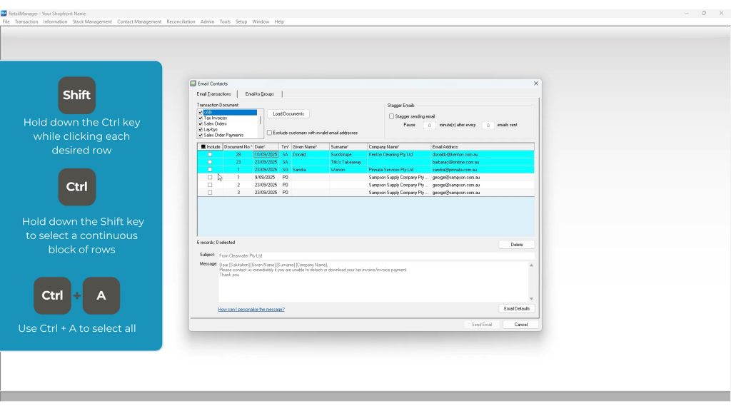 You now have the option to send the customers Sale, Invoice, Lay-By, Sales Order, Quote, Customer Special Order and Purchase orders transactions instantly via email directly from the POS Window. Even if no customer is entered, you can still send an email.
