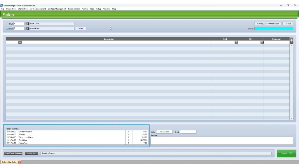 Quickly view the last five transaction dates for any customer right in the Sales Window - no need to dig into reports.