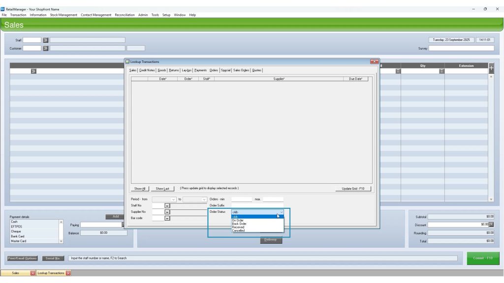 - New filters in Lookup Window: Payment Type in Sales tab and Order Status in Orders tab